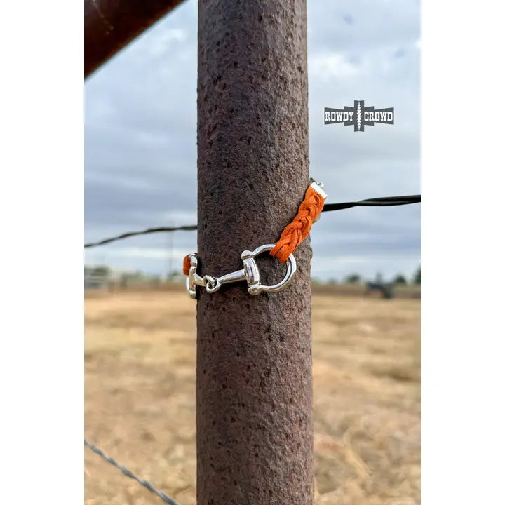 Saddle up your style with the Braided Bit Bracelet! Featuring a polished silver snaffle bit centerpiece and a hand-braided suede band in a vibrant rust, this piece brings just the right mix of punchy and refined. Whether you’re riding fences or just riding the vibe, this bracelet is the perfect way to show your rowdy side with a touch of shine. * 9.5" with extender & clasp
