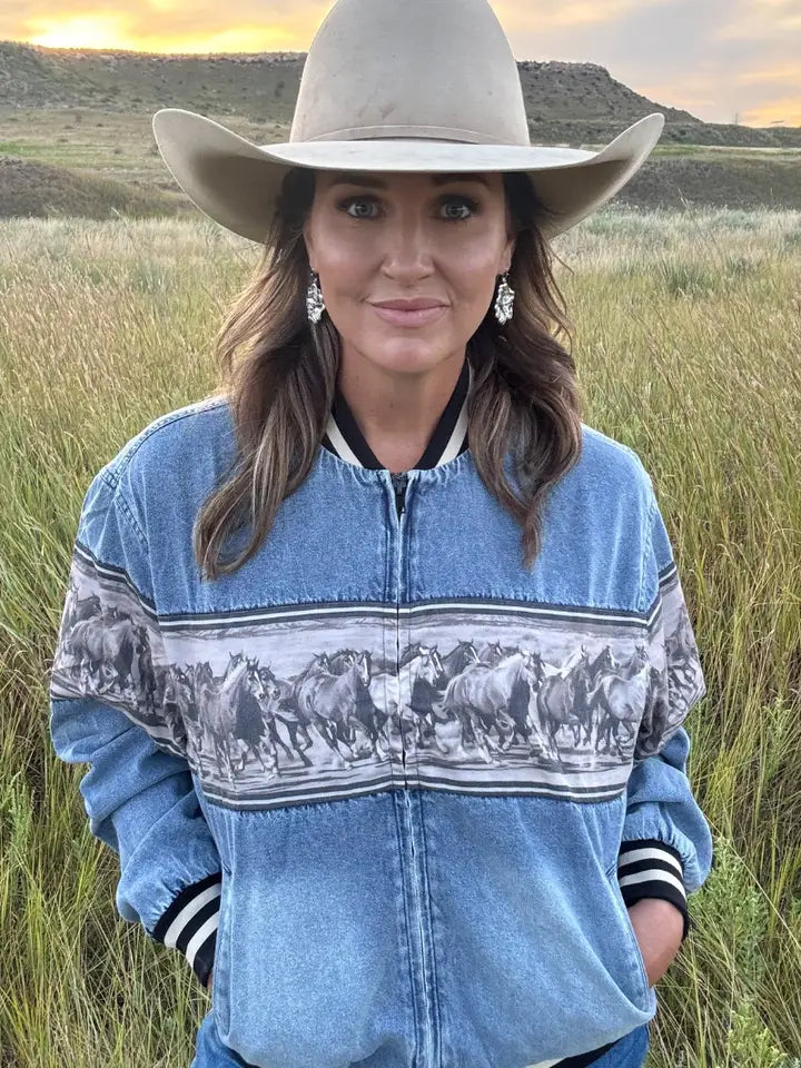 Perfect vintage look for the NFR! This denim jacket features a spirited design of a herd of horses running, capturing freedom and movement in every detail. Perfect for adding a lively touch to your casual wardrobe, it combines classic bomber silhouette with a fun, dynamic print for a look that’s full of life and character.